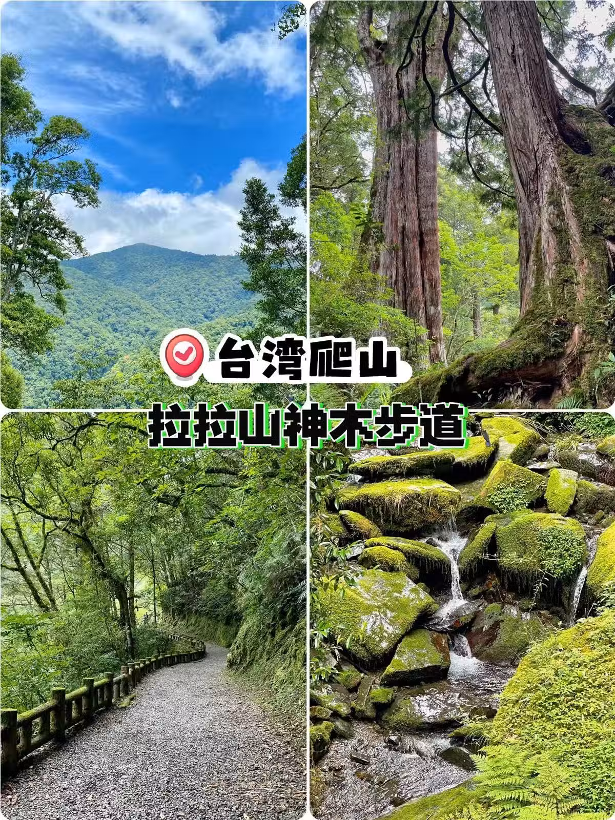 整段走完半小時而已,可以帶一些吃的,走走停停,聽一聽溪流聲,呼吸新鮮空氣,裡面樹都很高,完全不會曬,很舒服很涼爽的步道。登上拉拉山神木群步道,仿佛踏入了一個神秘而寧靜的世界。這里地處群山環繞之中,空氣清新,風景如畫。沿著蜿蜒的小徑徜徉,耳畔傳來鳥鳴聲聲,讓人仿佛迷失在童話般的世界裡。
