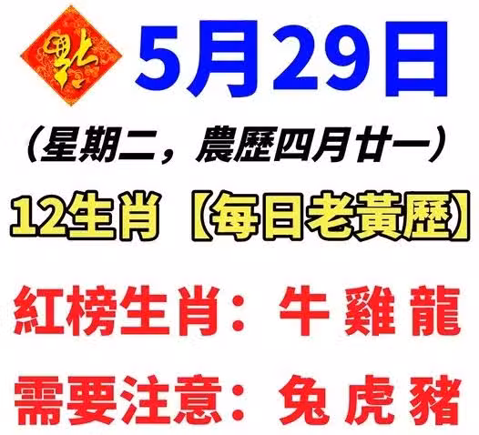 5月29日十二生肖【每日老黃曆】 紅榜生肖:牛 雞 龍 需要注意:兔 虎 豬