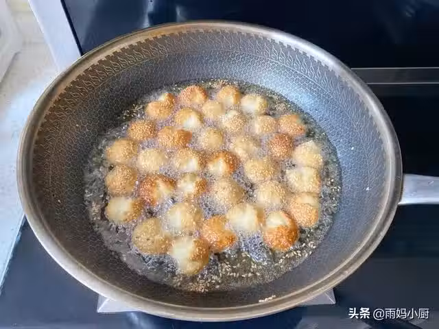 11、中小火慢慢炸制金黃,可以看到麵糰個個都開口笑了,用漏網撈出瀝干油脂。