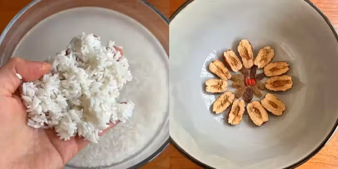2、再鋪上一層糯米;接著再鋪上一層紅棗和剩餘的葡萄乾,撒上適量的紅糖。料想加啥就加啥!