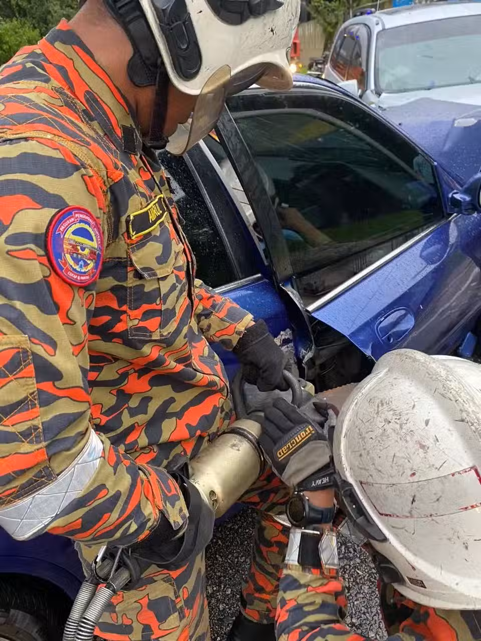 消拯員用工具撬開車門,救出傷者。
