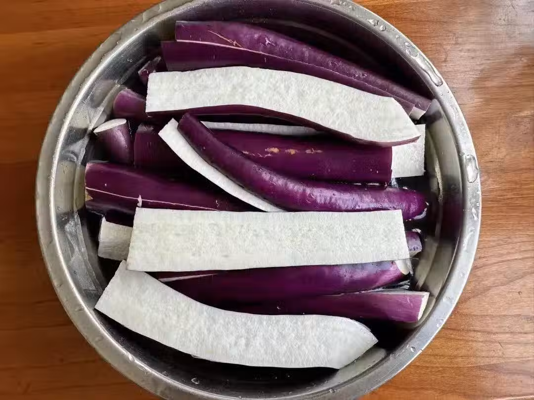 2、茄子切口朝下放在籠屜上,開水上鍋蒸大約10分鐘左右,筷子能輕鬆穿透即可。