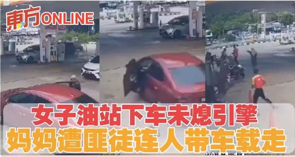 透過社媒一段流傳視頻,顯示一名巫裔女子駕駛一輛紅色轎車前往某油站,事後未熄滅車子引擎便下車。隨後鏡頭出現一名男子駕駛一輛摩哆車,停靠在油站處後,便直接跳上車開走該輛車子,連帶坐在駕駛座旁的老婦,也一同帶離現場。