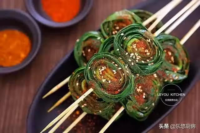 第三步:取一根韭菜從頭開始捲起,儘量卷的緊一點,然後用竹籤子串起來。