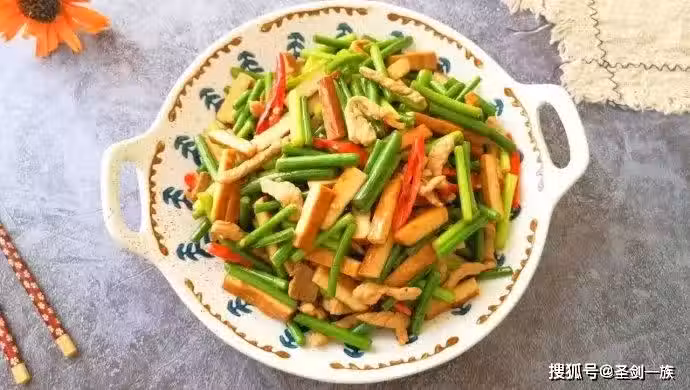 4、然後倒入豆乾,加入生抽、蚝油和雞精調味,翻炒均勻炒至入味即可出鍋裝盤開吃。