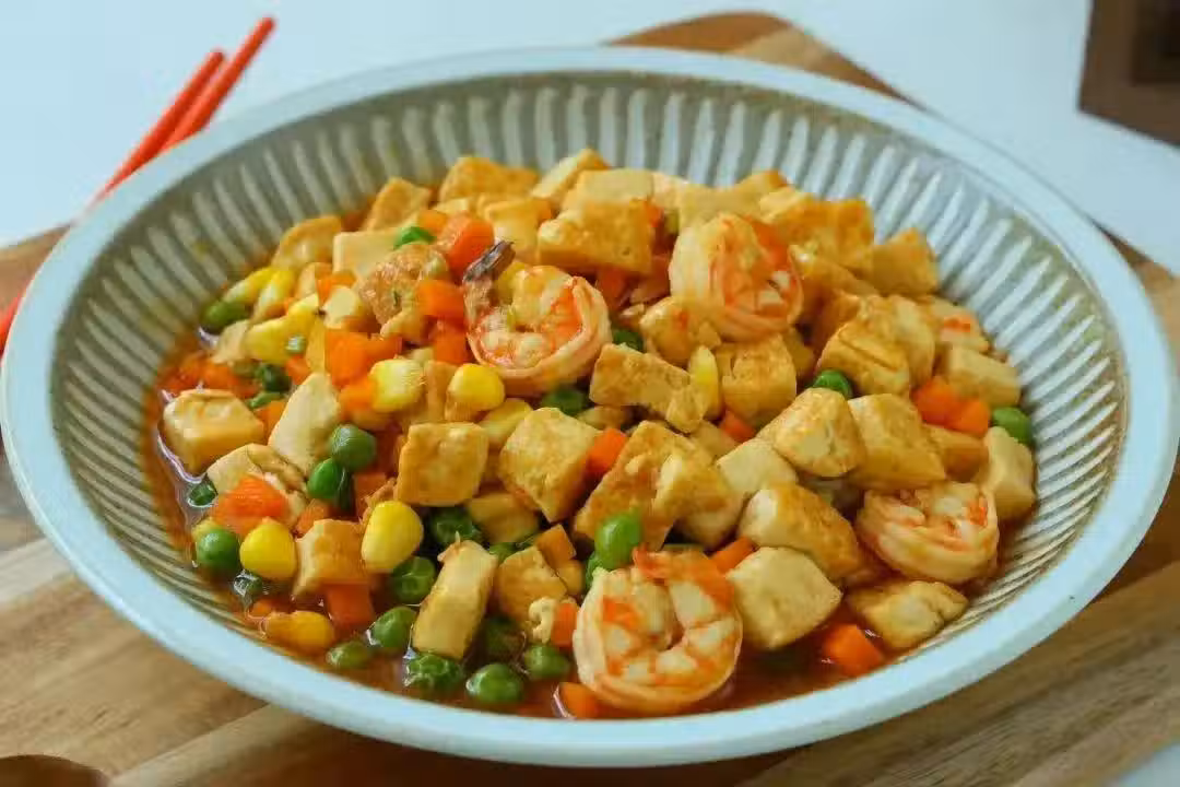 豌豆、玉米粒、胡蘿蔔丁等雜蔬的加入,不僅為這道菜增添了豐富的色彩,更是將營養提升到了一個新的高度。豌豆的清香、玉米粒的甜潤、胡蘿蔔丁的爽脆,與蝦仁和豆腐的鮮美完美融合,形成了一種層次分明的口感。