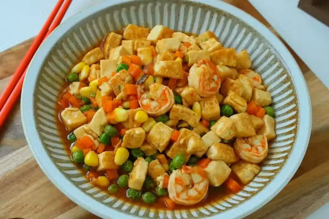 7、夏天小朋友吃雞肉魚肉容易上火,這個豆腐蝦仁燴雜蔬非常好,營養豐富,不論是鈣還是蛋白質都非常豐富,非常適合家裡的小朋友和老人吃!