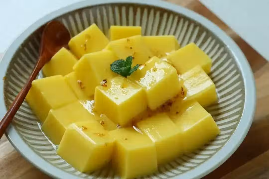 待其冷卻後,放入冰箱冷藏,玉米涼糕便完成了它的初步變身。從冰箱中取出,那純凈無瑕的色澤,仿佛一塊美玉,讓人不忍下口。切成小塊,擺入盤中,淋上花蜜,一道色香味俱佳的玉米涼糕便呈現在眼前。