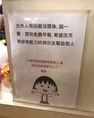 根據《ETtoday新聞雲》報導,有位名叫鼎鼎的網友過去經過一間早餐店門口,不料竟意外發現店內貼了一張公告,吸引他上前一探究竟,才知道原來上頭寫著的是:「有困難沒關係,說一聲、提供免費早餐」,瞬間讓他暖到心坎裡。
