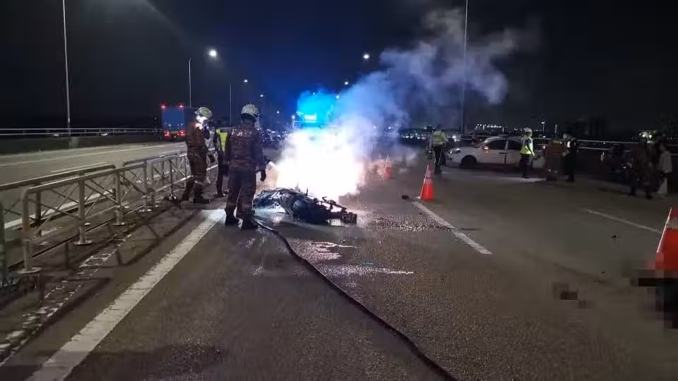 (新山8日訊)一名新加坡男子深夜騎摩哆從新加坡入境我國途中,在關卡前路段,失控猛撞一輛在大道上U轉的轎車,摩哆接著起大火被燒毀約90%,摩哆騎士當場慘死。