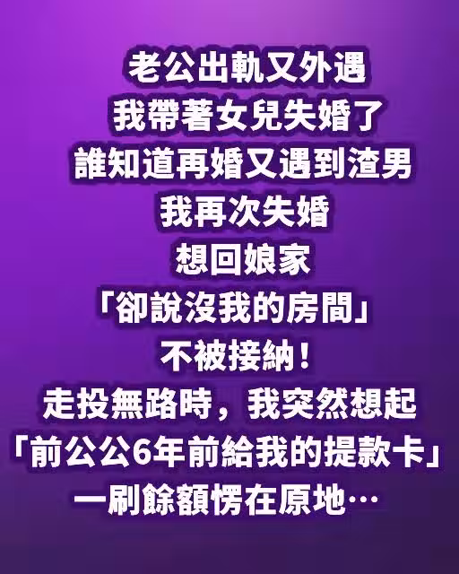 老公出軌又外遇,我帶著女兒失婚了…誰知道再婚又遇到渣男我再次失婚,想回娘家「卻說沒我的房間」不被接納! 走投無路時,我突然想起「前公公6年前給我的提款卡」一刷餘額愣在原地~