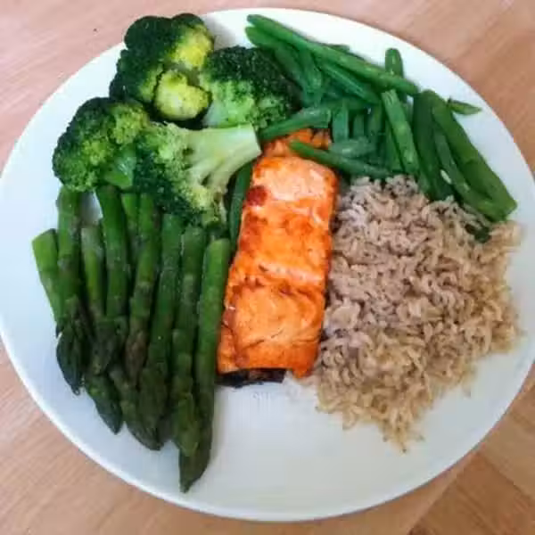 午餐:水煮四季豆+水煮蘆筍+水煮花椰菜+香煎鮭魚+拳頭大的糙米飯