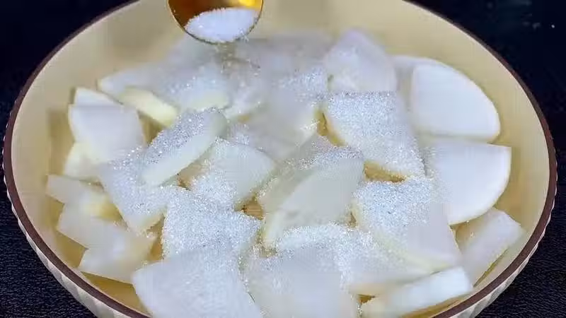 2.將切好的白蘿卜放入大碗中,加入兩大勺白糖。不要使用鹽,因為鹽會使白蘿卜變軟。拌均勻後,腌制白蘿卜20分鐘,使其釋放水分。