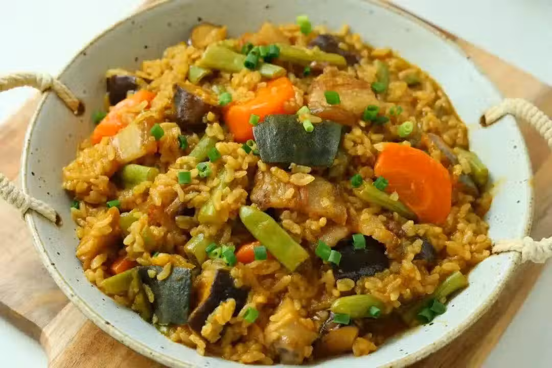 製作配料:大米2量杯 胡蘿蔔1根 貝貝南瓜1個 豆角1大把 香菇300克 五花肉1塊 生抽4勺 老抽2勺 鹽2勺 白鬍椒粉+姜粉1小勺 蔥蒜適量