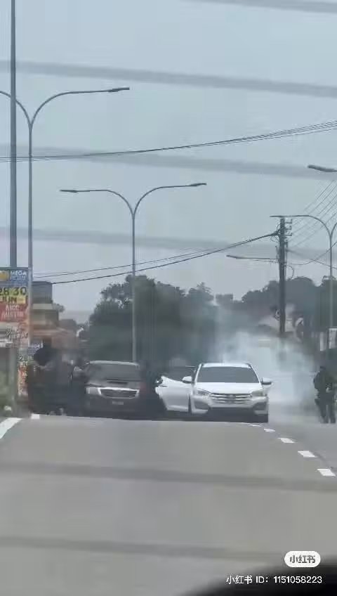 網傳新山市區大馬路上發生槍擊事件,數名特警朝一輛白色車連開多槍。