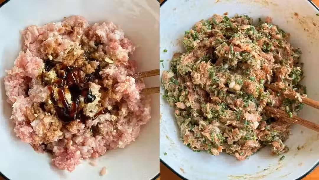 4、取出醒好的面劑,稍微抻拉一下,使其變得稍微扁平。然後,將肉餡均勻地放在面劑中央,用另一個面劑蓋上,並將邊緣捏合緊實,確保餡料不會漏出。將所有包好的面劑放在刷有食用油的保鮮盒中,這樣可以防止面劑之間粘連。