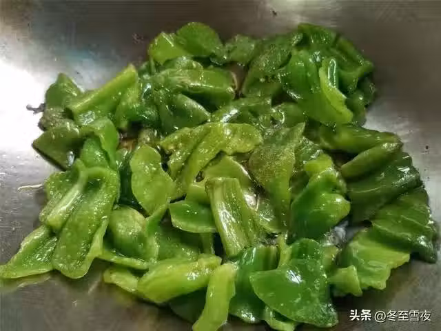 4.鍋內加入油燒熱,下入青椒塊翻炒,將青椒塊翻炒至表面起皺皮,將青椒塊盛出待用。