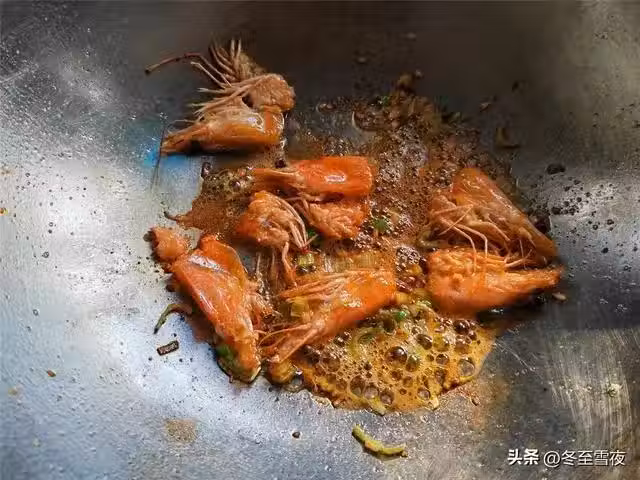 5.鍋內加入少許油,燒熱,下入蝦頭,把蝦頭小火煎至變紅,用勺子敲蝦頭,把蝦黃敲出來,這樣湯色紅潤,味道鮮美,下入蔥花和薑末炒香。
