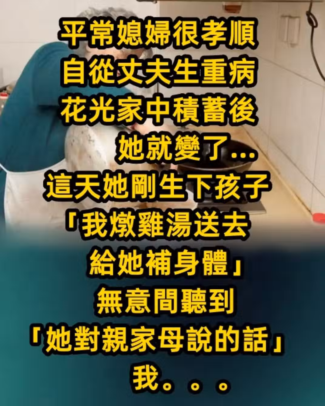 平常媳婦很孝順,自從丈夫生重病花光家中積蓄後,她就變了… 這天她剛生下孩子「我燉雞湯送去給她補身體」,無意間聽到「她對親家母說的話」我。。。