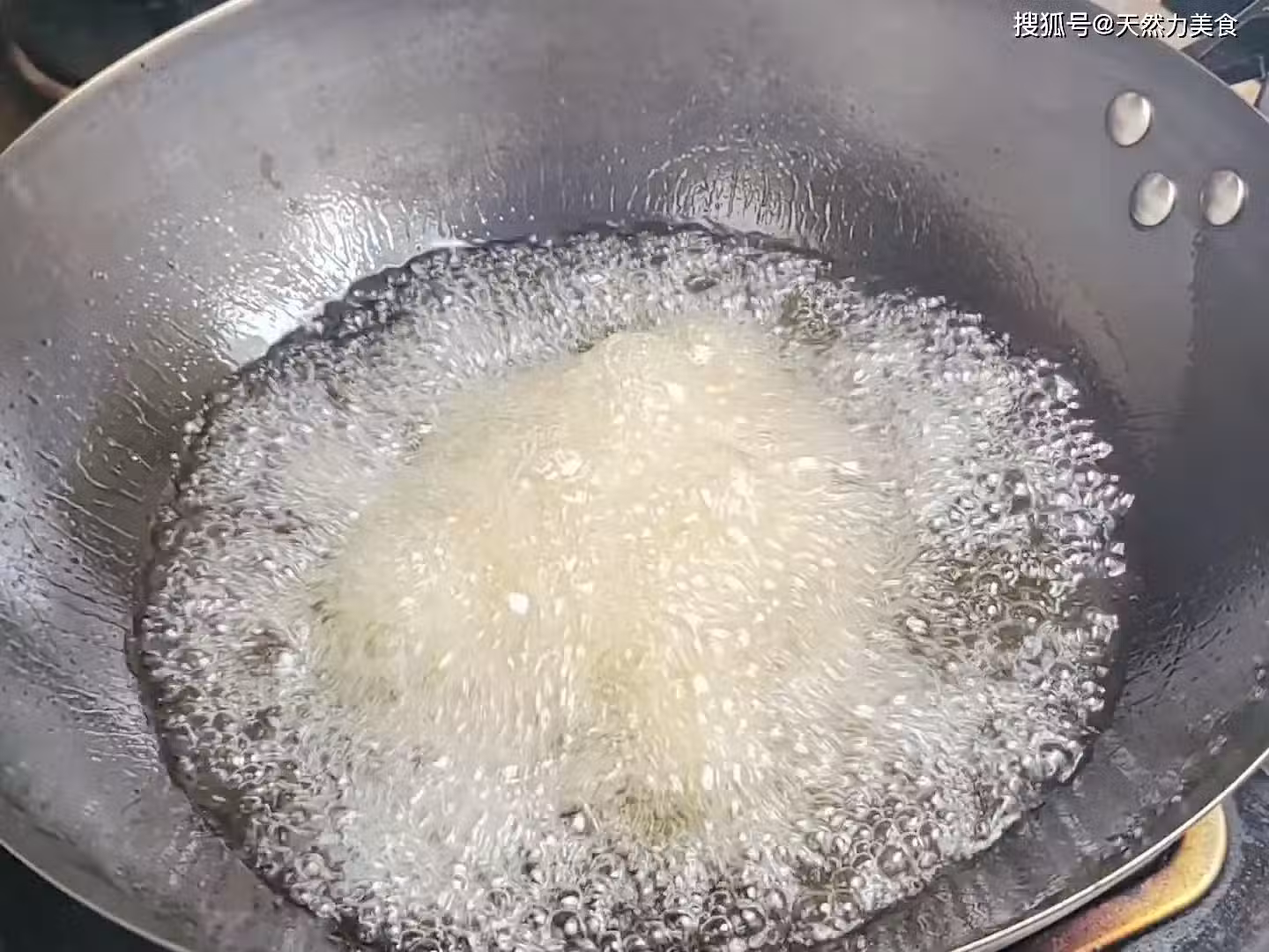 13、我們在炸香芋的時候油溫一定要高一點再下鍋,如果油溫太低的話,香芋會吸入大量的油,這樣吃起來就會膩。一直把香芋炸到表面有些金黃,炸到這個程度就說明已經到了出鍋的標準。把香芋倒出控油備用。