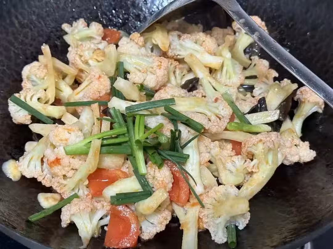 6、將炒好的「番茄炒花菜」盛入盤中,端上餐桌。這道菜色澤鮮艷、酸甜可口、清脆鮮嫩,無論是配飯還是下酒都是絕佳的選擇。它的味道咸中帶點微酸,非常開胃,讓人一吃就停不下來。