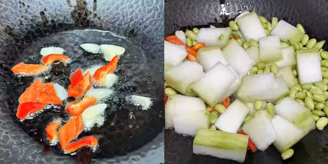3、接著,開始調味。加入適量鹽和老抽,繼續翻炒,讓調料充分滲透到食材中,為冬瓜和毛豆增添色彩和風味。然後,加入適量的清水,煮開後,將泡發好的乾貝放入鍋中。將鍋蓋蓋上,中小火燜煮約8分鐘。這段時間裡,乾貝的鮮味會慢慢滲透到冬瓜和毛豆中,使得整道菜更加鮮美可口。燜煮過程中,可以適時翻動食材,確保它們均勻受熱。