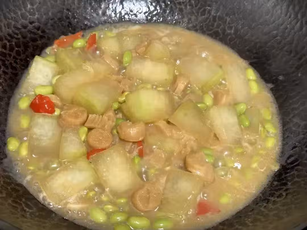 5、這個超級簡單又下飯,冬瓜鮮嫩爆汁,非常入味好吃,毛豆不僅增加了這道菜的顏值,更讓這道菜提升了品質和營養;乾貝主要提高了這道菜的整體口感和鮮味,真的巨巨巨下飯好吃!這道乾貝冬瓜毛豆燜煮不僅簡單易做,而且味道鮮美、營養豐富。冬瓜的鮮嫩與毛豆的清香在乾貝的加持下相得益彰,成為一道讓人回味無窮的家常美食。快來試試吧!