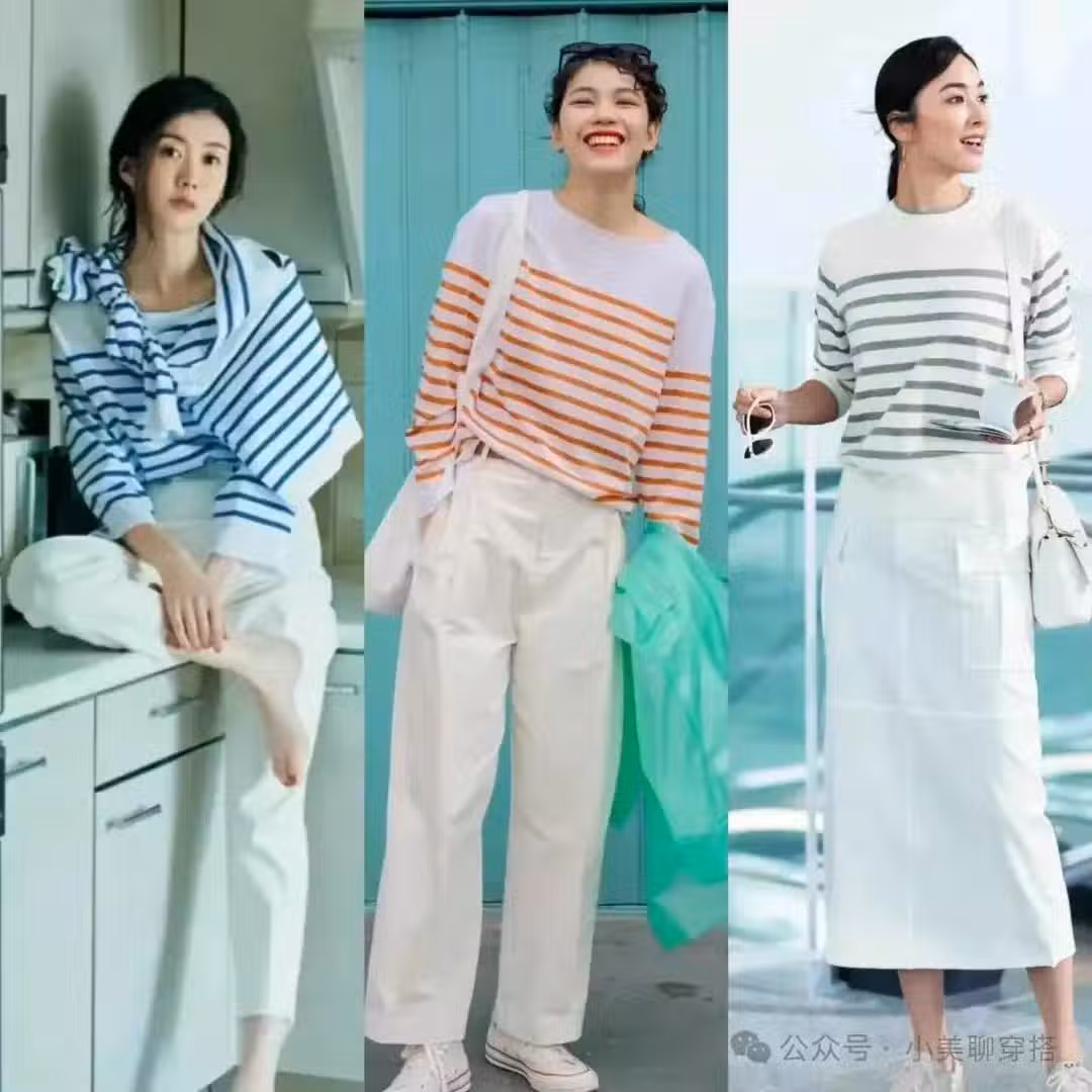 夏天蠻適合條紋的,比如藍白條紋、紅白條紋、綠白條紋……這些條紋都特別顯白,又帶著清新感,減齡效果不錯。