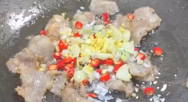 6、五花肉炒至金黃顏色好,我們把蔥,姜,蒜末和小米辣一起放入鍋中進行翻炒。