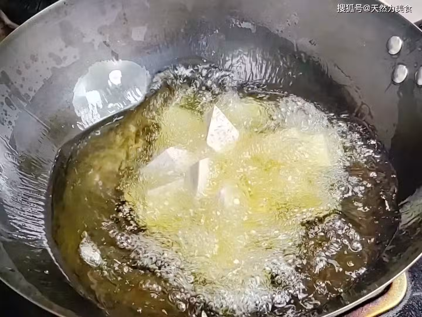 6、芋頭在炸制的時候全程保持大火,一直炸到芋頭的表面稍微有點金黃就可以了,整個炸制過程我大概用了2分鐘左右。這個時候的芋頭大概已經達到了7成熟以上,香芋的香味也已經很濃郁了。