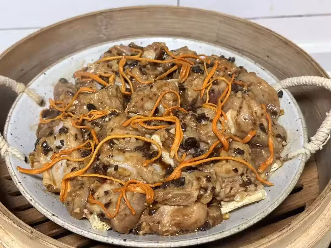 5、隨著蒸鍋的緩緩打開,一股混合了排骨、腐竹與蟲草花的香氣撲鼻而來,令人垂涎欲滴。排骨色澤紅亮,肉質軟爛脫骨,輕輕一咬,便能感受到濃郁的湯汁在口中爆開;底下的腐竹吸飽了排骨的精華,變得咸香入味,口感豐富;蟲草花的加入,則為這道菜增添了一抹清新與滋補。