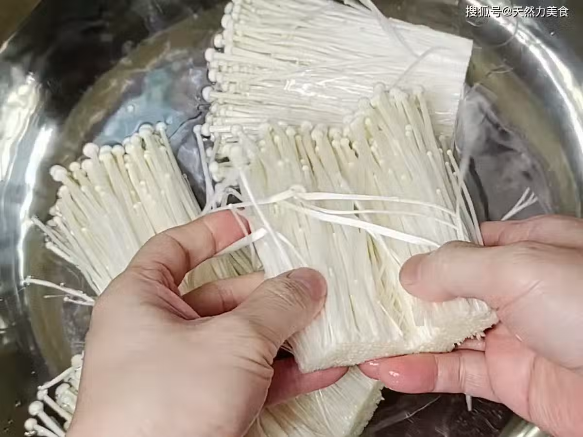 3、把清洗乾淨的金針菇平鋪在砂鍋中,這個時候的金針菇看起來好像很多,但是這個金針菇煮一下後就會縮水而變得很少。