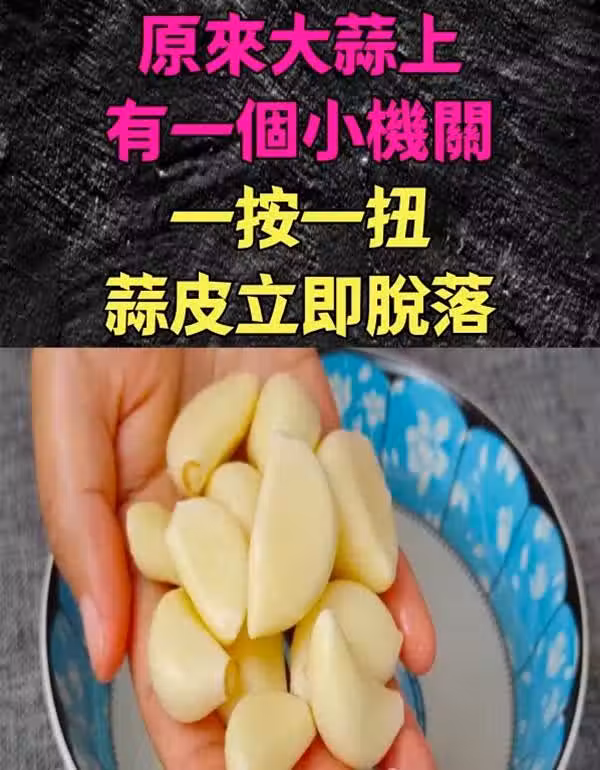 原來大蒜上有一個小機關,一按一扭,蒜皮立即脫落,2分鐘剝一碗