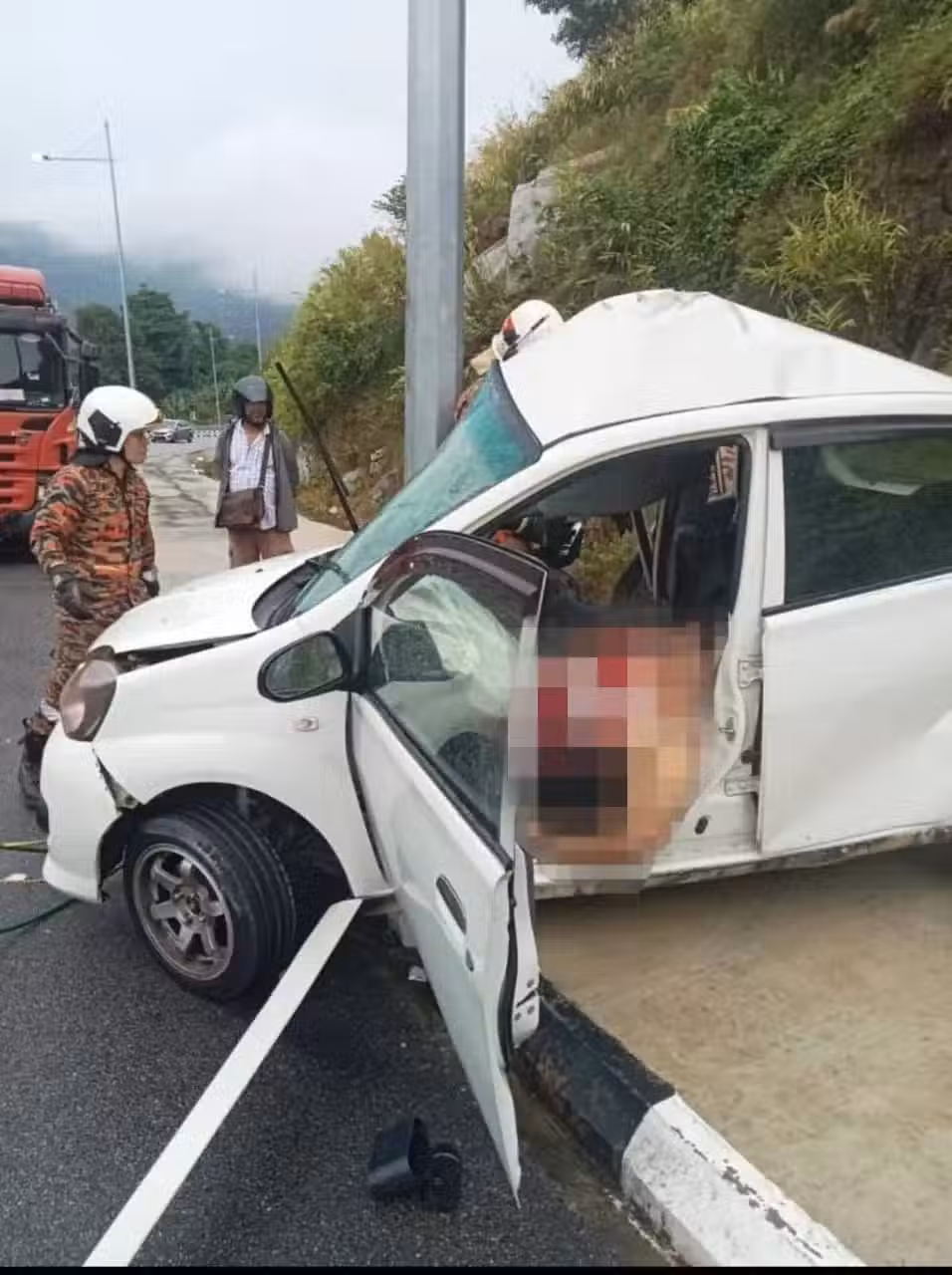 (檳城12日訊)疑雨天路滑撞路旁燈柱夾車內的女司機被證實斃命!