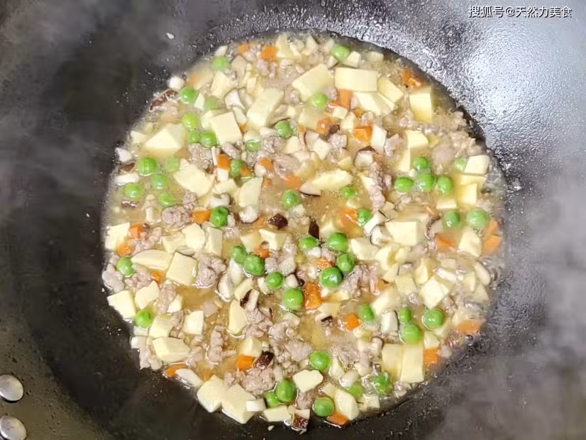 15、這時雞蛋羹也已經蒸夠時間了,可以開蓋出鍋了。把炒好的配菜澆在雞蛋羹的上面,這樣遇到美味好吃的豆腐雞蛋羹就做好了。