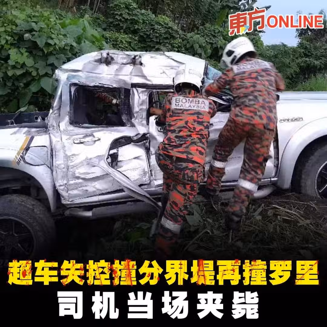 (拿篤14日訊) 超車失控撞向路中分界堤,復撞上一輛停放在路邊的羅里車後,釀禍的卡車司機連人帶車,撞向沖落路旁的渠道,當場夾斃!