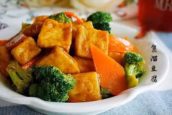 爆香蔥絲薑片蒜片,倒入豆腐和炒好的時蔬翻炒,最後倒入調味汁,再放些水澱粉,帶豆腐上包裹調味汁就關火。