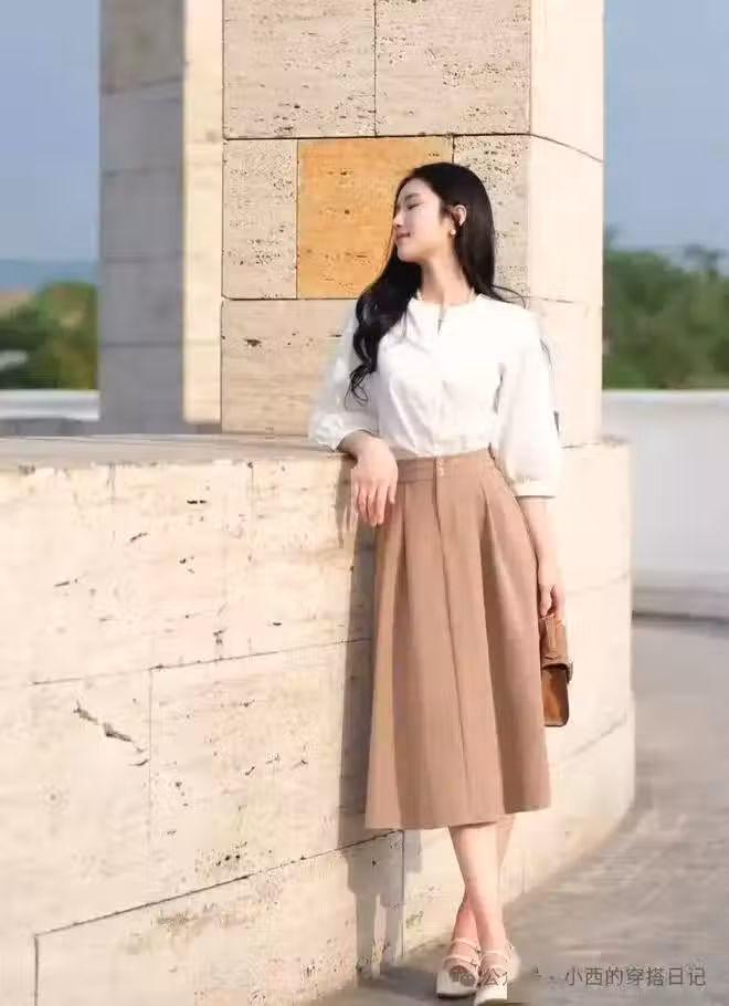 淺藍色襯衫搭配高腰黑色鉛筆裙,呈現出都市女性的幹練與優雅。黑色高跟鞋與印花手提包相得益彰,為整體裝扮增添了時尚感。步伐輕盈,目光堅定,街頭的車流仿佛在她的步伐中靜止。▼