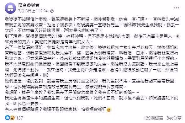 原PO老公因為這件事、和婆婆起爭執,也再三叮嚀如果婆婆私下約,絕對不要去,那宮廟看起來很不正派,「我還不敢跟娘家說,怕我媽會抓狂,有人有類似經驗嗎?」