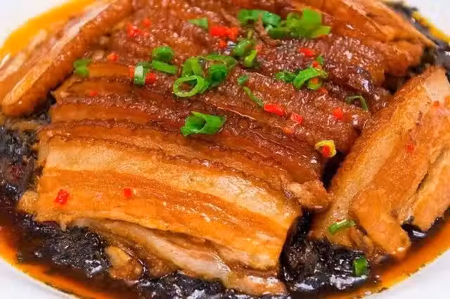 關火後取出肉碗,用圓盤蓋在上面,潷出湯汁,再將碗倒扣在盤中,大火燒熱炒鍋,將倒出的湯汁燒開,熬至濃稠,淋在肉上即可。