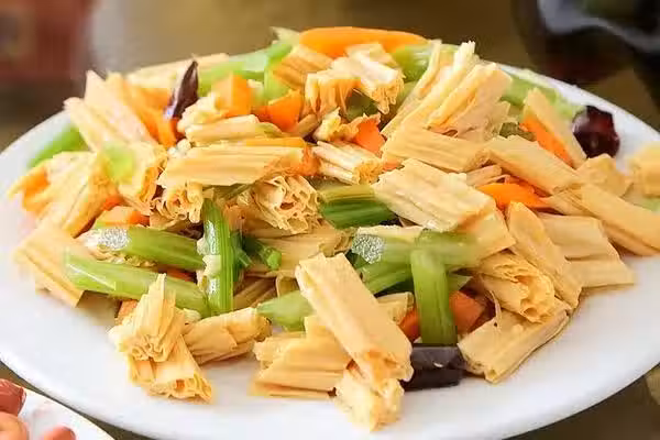 4.味精事先用開水化開,同醬油、精鹽、米醋一起澆在腐竹芹菜上;