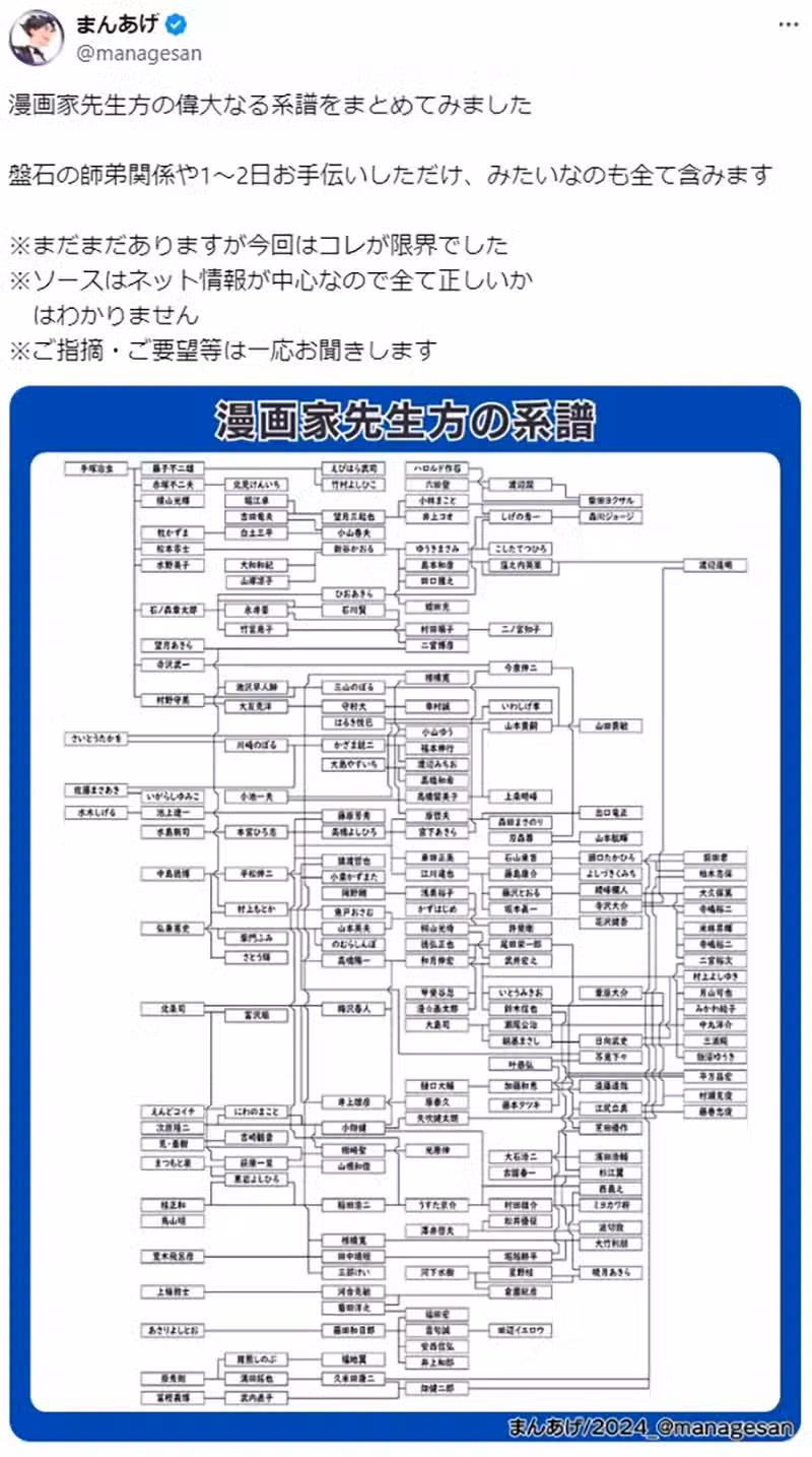 這位暱稱「まんあげ」的日本漫畫迷,最近公布了一張由他自己整理的「漫畫家家系圖」。圖中詳細整理了日本知名漫畫家們之間的傳承關係,隨即引髮網友們的議論!
