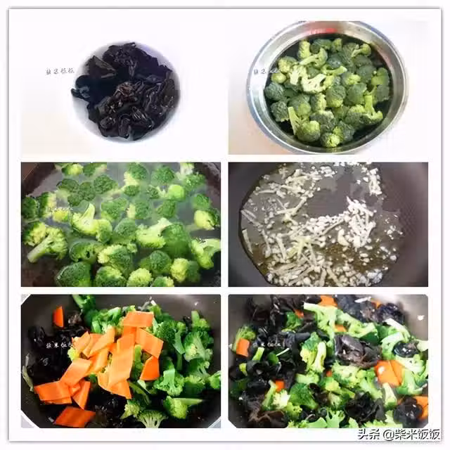 5,把處理好的西蘭花和木耳倒入鍋中,再搭配一些胡蘿蔔片提升菜色。