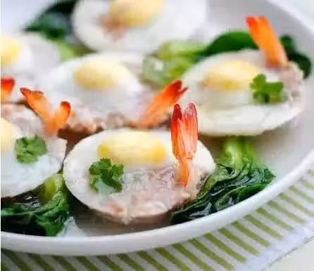 食材:蝦6條、豬肉末150g、上海青6棵、鵪鶉蛋6個、火腿末1大匙,香菜末少許、小碗(我用的蛋撻模,或根據現有工具選擇)調料:薑末、蔥末、胡椒粉1小勺、料酒1小匙、鹽1小匙、水澱粉、高湯、香油1匙、生抽1匙、蚝油1匙