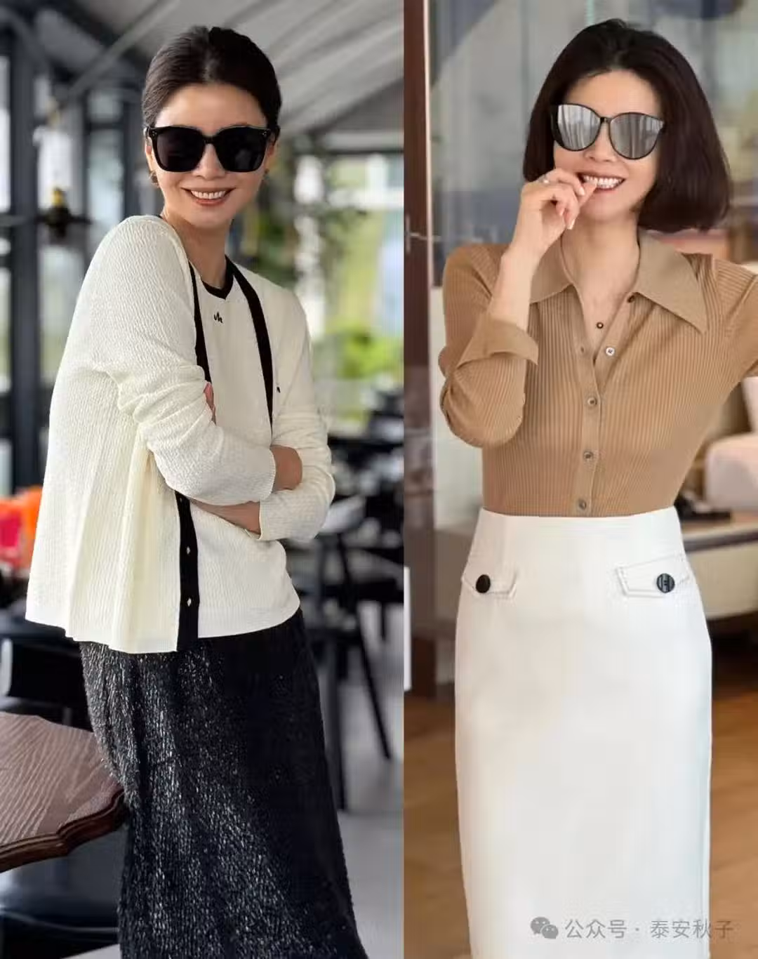 肩膀寬、脖子粗的女人建議選擇V領、大圓領的開衫,搭配不同色調的直筒裙,小個子女人還可以採用「賽衣角」的手法,營造出大長腿的同時也會顯得很精緻。