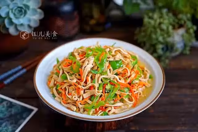 2、千張切成條狀,用水沖一遍。3、青椒去籽切成細絲。