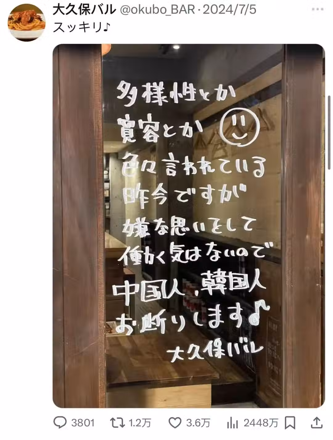 根據日媒指出,這家備受爭議的店位於JR大久保站附近,這裡聚集了很多外國人居住,周圍有很多韓國料理店,也有不少亞洲超市,走幾步就能到「韓流發源地」新大久保。這裡很多韓國人居住,沒想到還寫出如此「排外」的公告,大批網友感到無語「這是怎麼想的?」