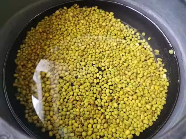 4、蓋上蓋子燜15分鐘,15分鐘之後,鍋中的綠豆已經吸收了飽滿的水分。