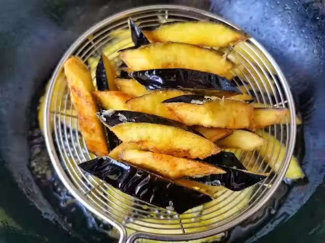5、等所有茄子炸好,將鍋中油溫升高,倒入茄子再復炸30秒,撈出控油。