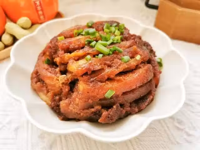 7、鍋中放入足量的清水,做好的米粉肉上鍋蒸一個半小時,蒸好之後倒扣在盤子裡,撒上一些蔥花就可以了。